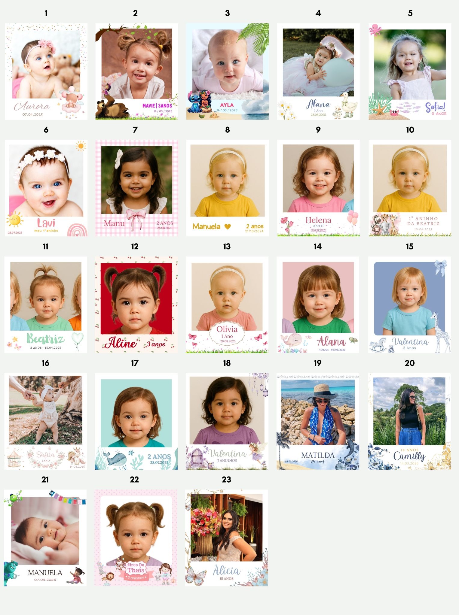 Veja abaixo os modelos disponíveis. Após a compra, você poderá enviar sua foto pelo link de envio e entraremos em contato para confirmar a legenda e o modelo desejado.